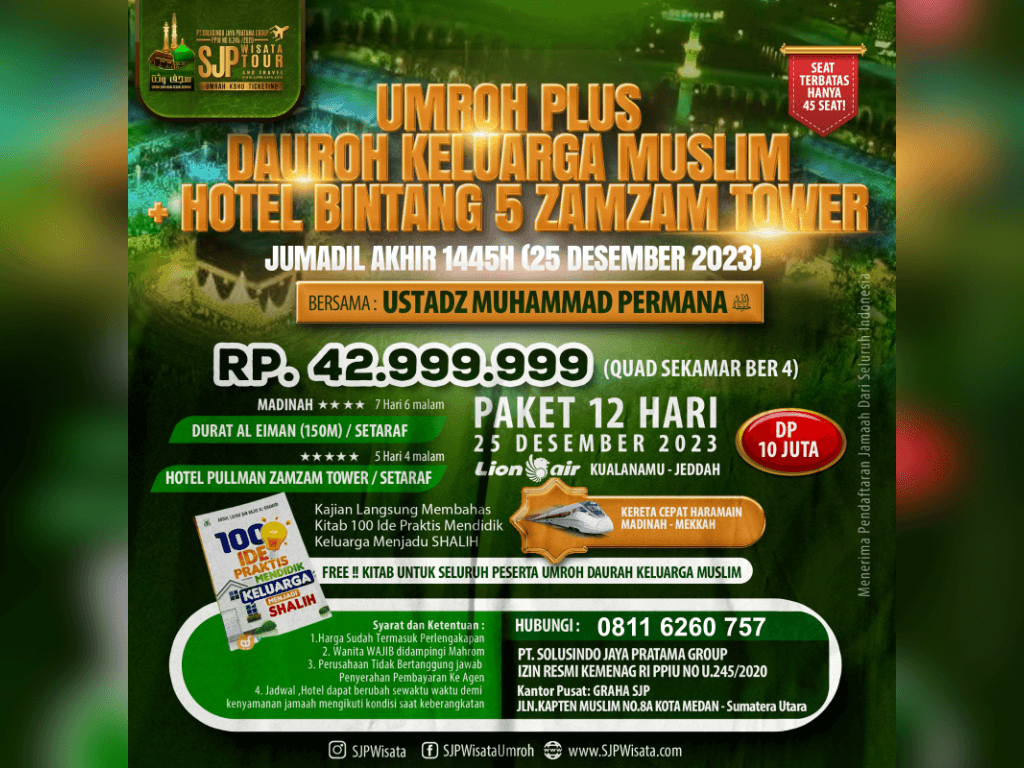 UMRAH PLUS DAURAH KELUARGA MUSLIM + HOTEL BINTANG 5 ZAMZAM TOWER
